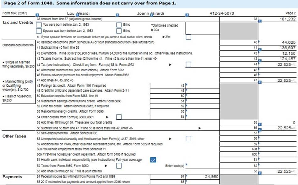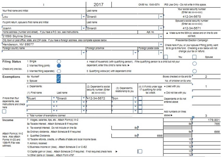 They recently bought a new home on 21680 Skyline Drive, Henderson, NV 89077. Their son, Stuart, attends the University of Pennsylvania full-time on a full scholarship. Stuart is claimed as a dependent on the Girardis’ tax return. Their SSNs are Lou, 412-34-5670 Joann,412-34-5671 Stuart, 412-34-5672 Their birth dates are as follows: Lou, May 18, 1964 Joann, December 24, 1964 Stuart, May 9, 1997 Their relevant tax information follows: Joann is an attorney and owns her law firm, which is operating as an S corporation. Her W-2 information and Schedule K-1 from her law firm are as follows: