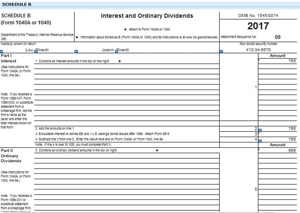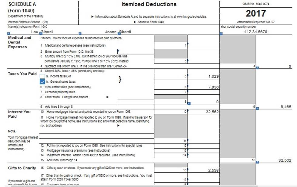 Prepare the Girardis’ federal tax return for 2017. Use Form 1040, and Schedules A, B, and E. Assume that the Girardis do not qualify for any credits (although they may). For any missing information, make reasonable assumptions. The taxpayers had qualifying health care coverage at all times during the tax year. (Assume no AMT although it may apply; Form 6251 or the AMT calculation is not required.) (List the names of the taxpayers in the order in which they appear in the problem. Do not round intermediate computations. Input all the values as positive numbers. Instructions can be found on certain cells within the forms. Round your final answers to nearest the nearest whole dollar amount.) Use the appropriate Tax Tables or Tax Rate Schedules.