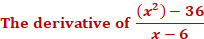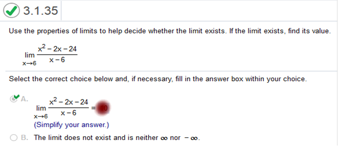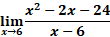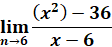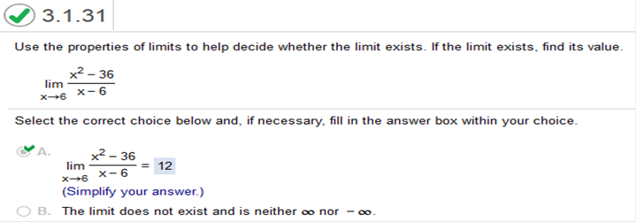 Then we plug in the value 6. We can find the derivative of the numerator and denominator separately. The formula for finding a derivative is nn – 1 with “n” being the exponent. So, what we do is multiply the value of the exponent by the number in front of it and subtract 1 from the exponent. For instance, if we have x2 and need to find the derivative we multiply 2 (which is the exponent) by 1, and subtract 1 from the exponent. So, it would be 2(1)2 – 1. The derivative of x2 is 2x. If a number value has no exponent, then the derivative of that number is 0. For instance, the derivative of 1 = 0, 2 = 0, 3 = 0, and so on. The derivative of x2 – 36 = 2x The derivative of x – 6 = 0 We are left with 2x. Now we plug in the value 6. 2(6) = 12 Use properties of limits to find the indicated limit. It may be necessary to rewrite the expression before limit properties can be applied.