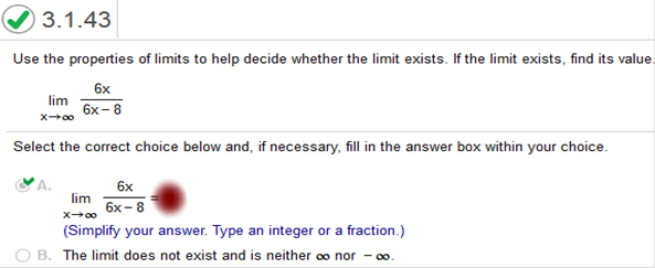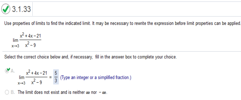 Find the derivative and plug in the value of 3. The derivative of the limit is in fraction form: 2x + 4 / 2x 2x + 4 / 2x We plug in the values. 2(3) + 4 / 2(3) = 10 / 6 Now we reduce to the fraction Use the properties of limits to help decide whether the limit exists. If the limit exists, find its value.