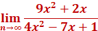 This is a little trick so I will break the problem down. We need to find the derivative of First, we find the derivative of 9x2 + 2x = 18x + 2 Next, we find the derivative of 4x2 – 7x + 1 = 8x – 7 So, we are left with a fraction Since we will be plugging in the value discounted from the rest of the values in the fraction, and the right side will be cancelled out. So, we will have So, we simplify the fraction to