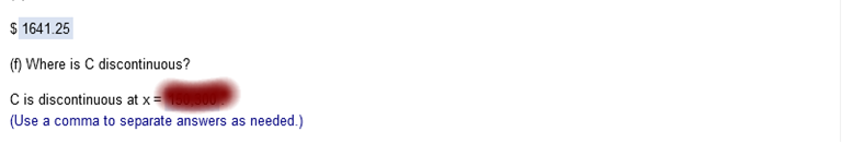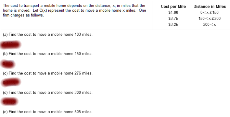 Explanation Solve 2x2 + 3x = -3 for x x = -1, and -1/2 Solve the limit for x = -4 for both. When both limits = the same, then f is continuous The cost to transport a mobile home depends on the distance, x, in miles that the home is moved. Let C(x) represent the cost to move a mobile home x miles. One firm charges as follows.