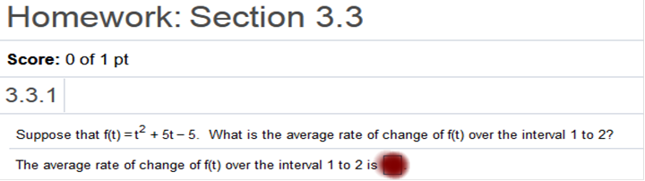 f(b) – f(a) / b – a f(t) = t2 + 5t – 5 f(1) = (1)2 + 5(1) – 5 f(1) = 1 + 5 – 5 = 1 f(2) = (2)2 + 5(2) – 5 f(2) = 4 + 10 – 5 = 9 f(b) – f(a) / b – a 9 – 1/ 2 - 1 = 8 The average rate of change of f(t) over the interval 1 to 2 is 8 Check https://www.emathhelp.net/calculators/calculus-1/average-rate-of-change-calculator/