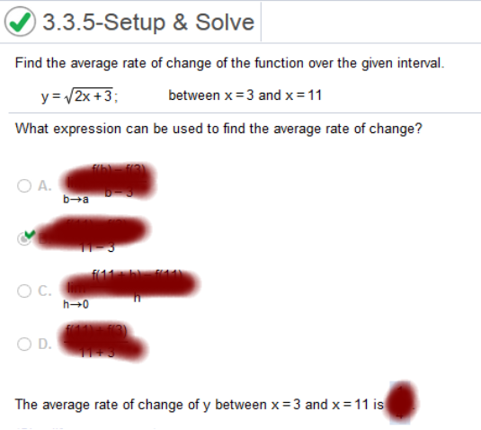 Find the average rate of change of the function over the given interval. y = √2x + 3 between x = 3 and x = 11 f(b) – f(a) / b – a f(3) = √2(3) + 3 = √6 + 3 = √9 = 3 f(3) = √2(11) + 3 = √22 + 3 = √25 = 5 f(b) – f(a) / b – a 5 – 3 / 11 - 3 = Find the average rate of change of the function over the given intervals f(x) = 7x3 + 7; a) [2, 4], b) [=3, 3]