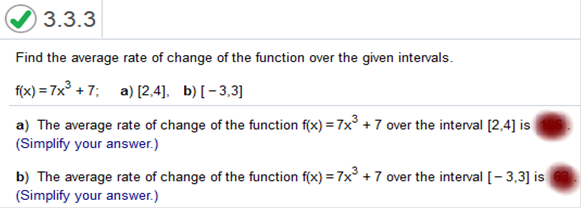 We simply plug in the values, subtract (larger from smaller, and divide by the larger value of the set minus the smaller value. a) 7(4)3 + 7 – 7(2)3+ 7 / 4 – 2 = 455 – 63 / 2 = 392 / 2 = 196 The next one is tricky. Watch carefully how I factor the values. b) 7(3)3 + 7 – 7(-3)3 + 7 / 3 – (-3) = 196 – (-182) / 6 = 378 / 6 = 63 Find the average rate of change for the function over the given interval. y= ex between x = -4 and x = -2