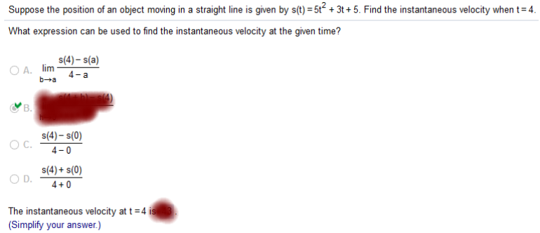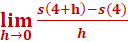 Part 1: the limit definition of derivative is And we are given the value of x, so we simply plug in the value of x and replace f with s because we are given the The formula for the straight line at “s(t)” = 5t2 + 3t + 5 Part 2: is a lot easier. We already covered the steps to finding the derivative of a function. So, we need to find the derivative of s(t) = 5t2 + 3t + 5 and plug in the value of t = 4. Remember the derivative of 5t2 is 5(2)t2 – 1 = 10t 3t is 1(3)1 – 1 = 3 The derivative of a number without a variable or exponent is 0 So, we are left with 10t + 3 Now we plug in the value 4 10(4) + 3 = 40 + 3 = 43 What is the value of the limit?