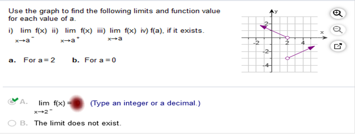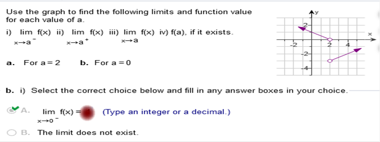 We are given x-> -2 and the limit meets on the graph at +1 We are given x-> 0 and the limit does not meet. It vanishes, therefore the limit does not exist Use the graph to find the following limits and function value for each value of a.