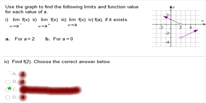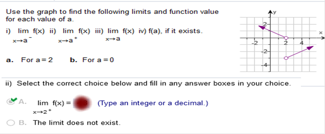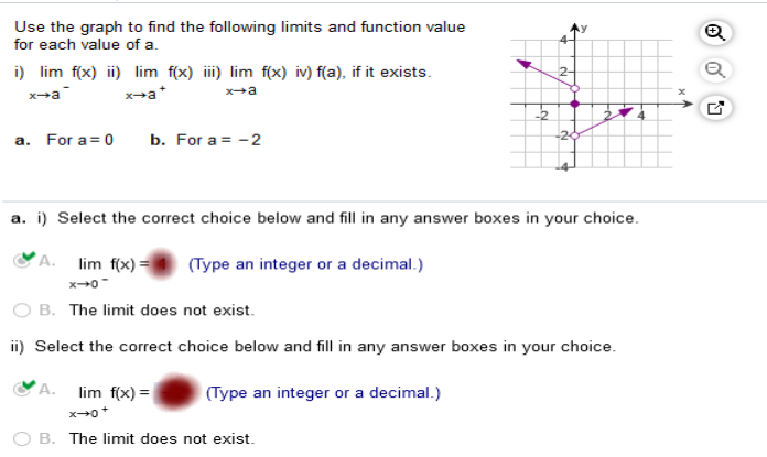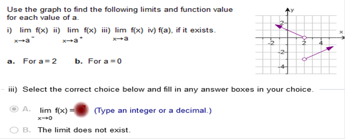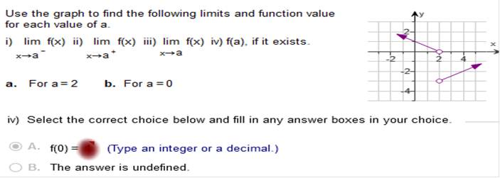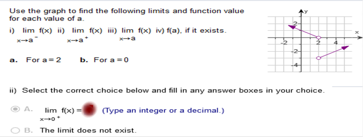 Study my answers and how they match the graph... Use the graph to find the following limits and function value for each of the value of a.