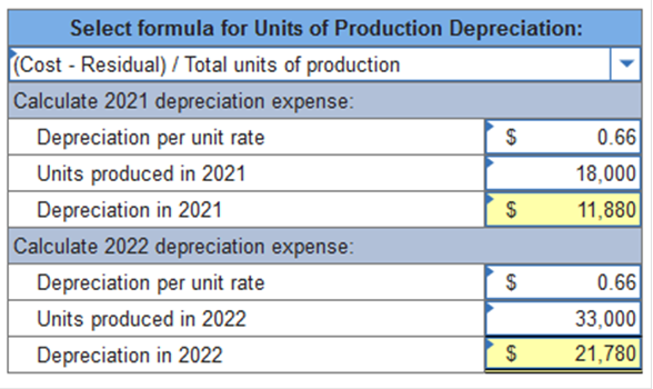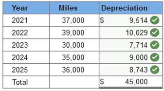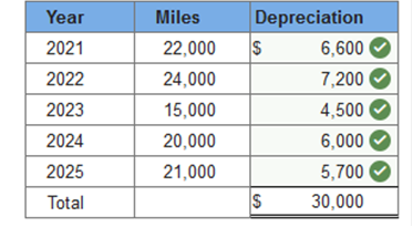Required information Exercise 11-1 (Static) Depreciation methods [LO11-2] Skip to question [The following information applies to the questions displayed below.] On January 1, 2021, the Excel Delivery Company purchased a delivery van for $33,000. At the end of its five-year service life, it is estimated that the van will be worth $3,000. During the five-year period, the company expects to drive the van 100,000 miles. Required: Calculate annual depreciation for the five-year life of the van using each of the following methods. Exercise 11-1 (Static) Part 3 Units of production using miles driven as a measure of output, and the following actual mileage: (Do not round intermediate calculations.) ![]() Explanation 3. Units-of-production: