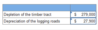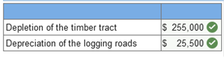 Exercise 11-17 (Algo) Depreciation and depletion [LO11-2, 11-3] At the beginning of 2021, Terra Lumber Company purchased a timber tract from Boise Cantor for $3,160,000. After the timber is cleared, the land will have a residual value of $610,000. Roads to enable logging operations were constructed and completed on March 30, 2021. The cost of the roads, which have no residual value and no alternative use after the tract is cleared, was $255,000. During 2021, Terra logged 510,000 of the estimated 5.1 million board feet of timber. Required: Calculate the 2021 depletion of the timber tract and depreciation of the logging roads assuming the units-of-production method is used for both assets. (Do not round intermediate calculations. Enter values in whole dollars.) ![]() Explanation Timber tract:
