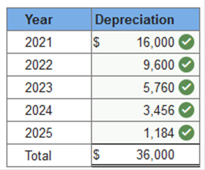 Required information Exercise 11-1 (Algo) Depreciation methods [LO11-2] Skip to question [The following information applies to the questions displayed below.] On January 1, 2021, the Excel Delivery Company purchased a delivery van for $40,000. At the end of its five-year service life, it is estimated that the van will be worth $4,000. During the five-year period, the company expects to drive the van 121,000 miles. Required: Calculate annual depreciation for the five-year life of the van using each of the following methods. rev: 05_15_2019_QC_CS-168776, 11_22_2019_QC_CS-191707 Exercise 11-1 (Algo) Part 2 2. Double-declining balance. (Round your answers to the nearest whole dollar amount.) ![]() Explanation 2. Double-declining balance: Straight-line rate of 20% (1 ÷ 5 years) × 2 = 40% DDB rate.