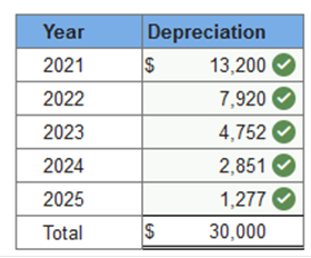 Required information Exercise 11-1 (Static) Depreciation methods [LO11-2] Skip to question [The following information applies to the questions displayed below.] On January 1, 2021, the Excel Delivery Company purchased a delivery van for $33,000. At the end of its five-year service life, it is estimated that the van will be worth $3,000. During the five-year period, the company expects to drive the van 100,000 miles. Required: Calculate annual depreciation for the five-year life of the van using each of the following methods. Exercise 11-1 (Static) Part 2 Double-declining balance. (Round your answers to the nearest whole dollar amount.) ![]() Explanation 2. Double-declining balance: Straight-line rate of 20% (1 ÷ 5 years) × 2 = 40% DDB rate.