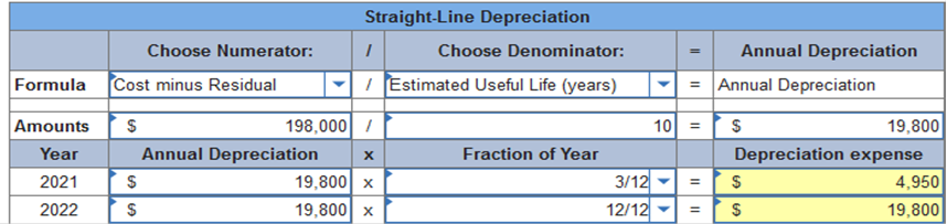 Required information Exercise 11-3 (Algo) Depreciation methods partial periods [LO11-2] Skip to question [The following information applies to the questions displayed below.] On October 1, 2021, the Allegheny Corporation purchased equipment for $203,000. The estimated service life of the equipment is 10 years and the estimated residual value is $5,000. The equipment is expected to produce 300,000 units during its life. Required: Calculate depreciation for 2021 and 2022 using each of the following methods. Partial-year depreciation is calculated based on the number of months the asset is in service. Exercise 11-3 (Algo) Part 1 1. Straight-line. ![]() Explanation 1. Straight-line:
