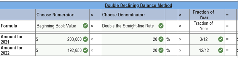 Required information Exercise 11-3 (Algo) Depreciation methods partial periods [LO11-2] Skip to question [The following information applies to the questions displayed below.] On October 1, 2021, the Allegheny Corporation purchased equipment for $203,000. The estimated service life of the equipment is 10 years and the estimated residual value is $5,000. The equipment is expected to produce 300,000 units during its life. Required: Calculate depreciation for 2021 and 2022 using each of the following methods. Partial-year depreciation is calculated based on the number of months the asset is in service. Exercise 11-3 (Algo) Part 2 2. Double-declining-balance. ![]() ![]() Explanation 2. Double-declining balance: Straight-line rate is 10% (1 ÷ 10 years) × 2 = 20% DDB rate