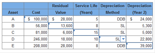 620,000 × $0.45 = $279,000 depletion Logging roads: $279,000 ÷ 6,200,000 board feet = $0.045 per board foot 620,000 × $0.045 = $27,900 depreciation Exercise 11-6 (Algo) Depreciation methods; solving for unknowns [LO11-2] For each of the following depreciable assets, determine the missing amount. Abbreviations for depreciation methods are SL for straight-line and DDB for double-declining-balance. (Do not round intermediate calculations. Round your final answers to nearest whole dollar.) ![]() Explanation Asset A: Straight-line rate is 20% (1 ÷ 5 years) × 2 = 40% DDB rate