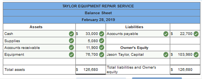 Use the above figures to prepare a balance sheet dated February 28, 2019. Analyze: What is the net worth, or owner’s equity, at February 28, 2019, for Taylor Equipment Repair Service?